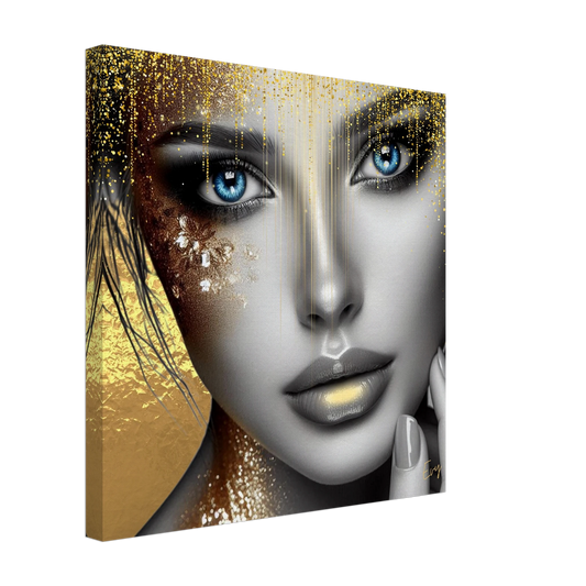 Stralende Ogen, Gouden Glorie Canvas Art – Luxe Wanddecoratie van Vrouw met Blauwe Ogen